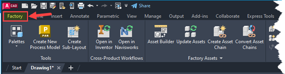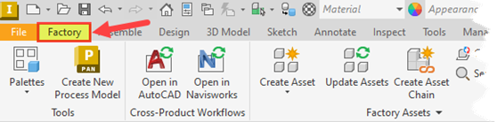 安装FDU并打开Inventor或AutoCAD软件后,您将有一个名为Factory的新色带进行工作。发明者工厂缎带看起来是这样的: