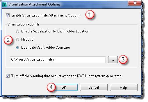 在“可视化文件附件选项”中,确保选中了“启用可视化文件附件选项”,然后选择平面列表或重复保险库文件夹结构,并指定本地或网络目录。单击OK。
