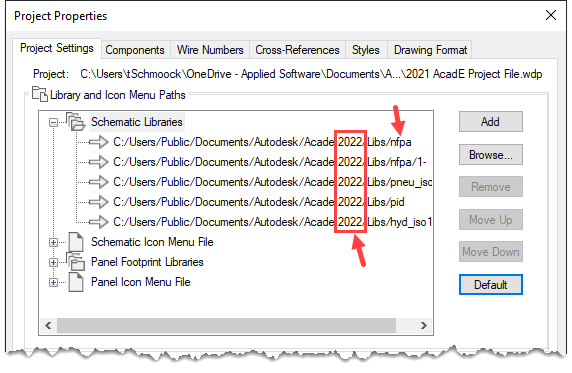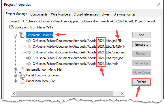 要将项目更新到环境文件中定义的位置,您需要在Library和Icon Menu Paths下的project Settings选项卡上选择四个类别中的每一个,并单击Default按钮。如果从一个版本到另一个版本使用默认路径,项目文件将自动更新到新的路径。但是,如果进行了任何更改,则路径将不会更新。