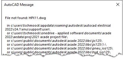 很多时候,用户得到这条消息是因为他们升级到软件的新版本,并且他们正在使用在以前版本中创建的项目文件。此外,如果项目是由另一家公司创建的,它将有不同的路径标识。开云体育全站客户端当合作的公司共享他们的项目时,就会发生这种情况,比如面板制造商提供完成的面板和图纸文件。激活旧项目后,用户尝试从库中检索一个符号,并将获得AutoCAD消息,显示该符号的查找位置。